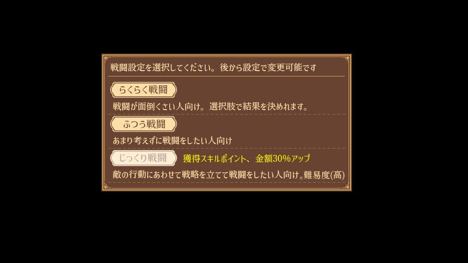 最後に戦闘設定を行うが↑の感じだとそこそこ遊びたい紳士は「ふつう戦闘」を選びたくなるだろう。我輩実際選んだし。しかしそこそこ遊びたいのであれば「じっくり戦闘」を選ぶべし。「ふつう」と「じっくり」ではシステムがまるで異なり、後者を選んでこそ戦闘を楽しめるからだ。