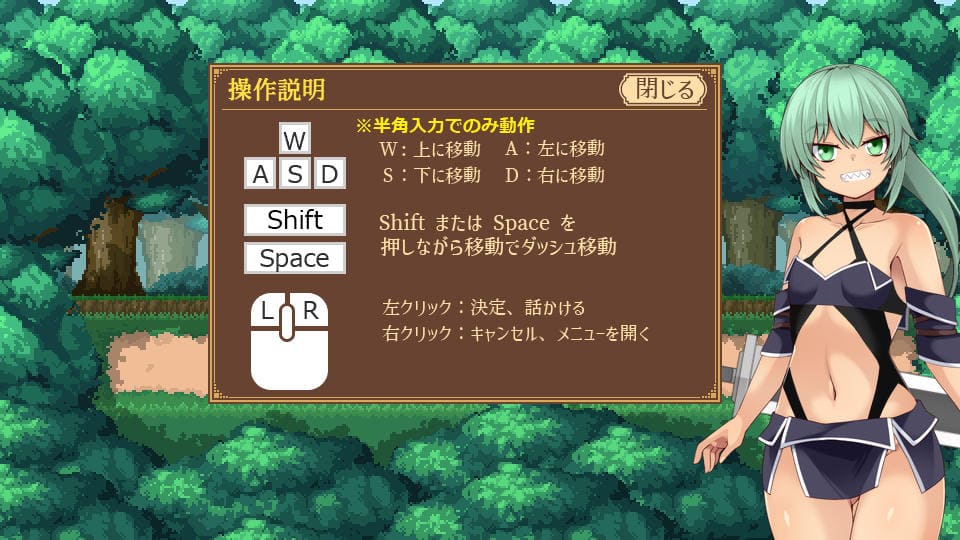 本作はWASDキー移動とマウスで決定・キャンセル・メニュー。キーボード派、RPGは特にな我輩としてはこの点のみ不満。移動は方向キー、決定はEnterでも可能だがね。
