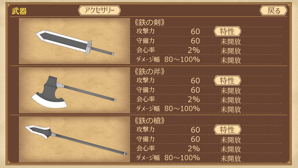 主人公の武器はデフォから所持している剣、斧、槍。鍛冶屋でそれぞれのパラメーターを上げることで強化していき、それぞれで使用・習得可能なスキルが異なる。ただ強化しても見た目や名前は何も変化しない。