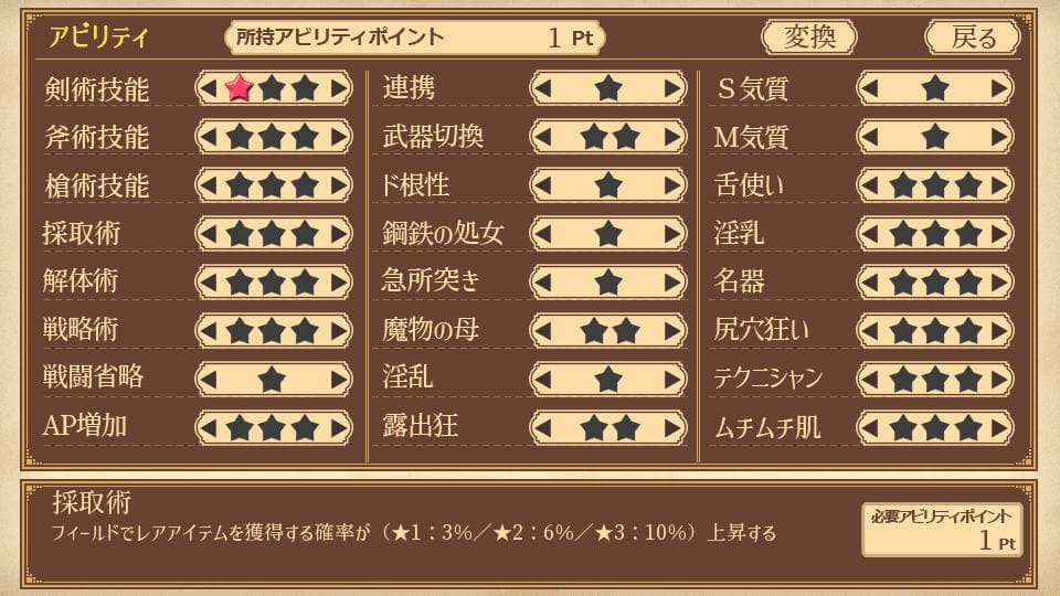 ▲左の項目「採取術」を伸ばすべし。他、解体術でドロップアイテムを、戦略術で得られるスキルポイントを伸ばすことができる。その他エロ状態での戦闘優位性アビリティも多々ゲット可能