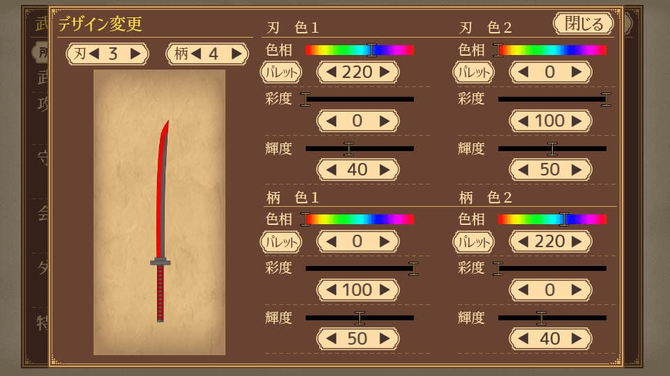 ▲剣の見た目カスタマイズ。刀身と柄の見た目と色を変更でき、大剣や刀など